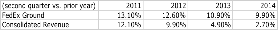 Looking at the table above, we can see that the FedEx Ground segment has been slowing, but it is still a big part of the business. This is especially true when you compare it to the company's consolidated revenue growth. Over the same time frame, FedEx Ground has grown revenue by an average 11.6% per year, far faster than the 7.4% rate seen by the company as a whole.