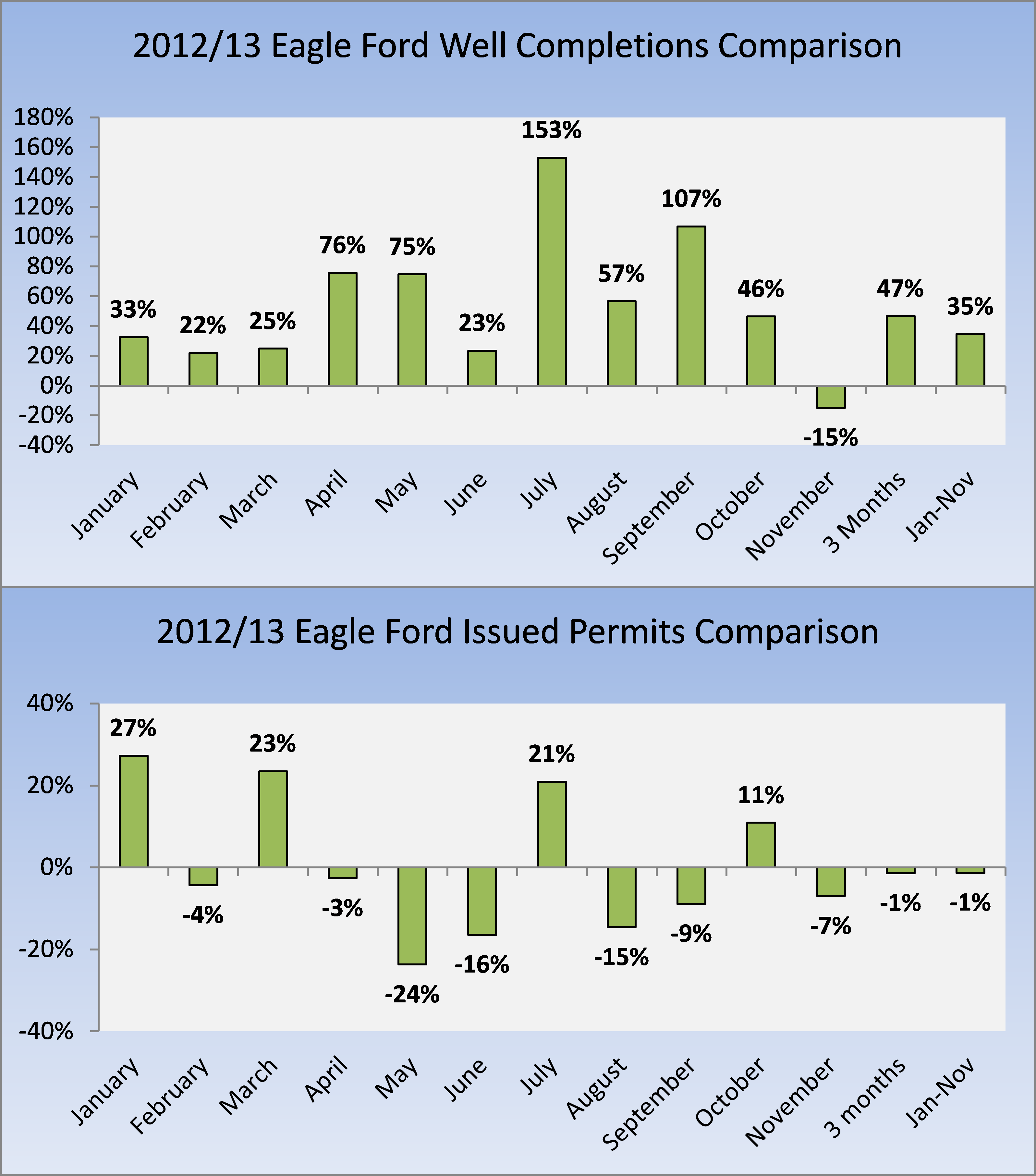 Through November, well completions in the play are up 47% over the comparable 2012 period. Drilling activity proceeded similarly in the past three months, increasing 35% compared to 2012. However, issued drilling permits and new oil-field discoveries are a different story. Approved permits and new oil-field discoveries are down 1% and 40%, respectively YTD, as heightened 2013 E&P activity has uncovered the majority of drillable land within the Eagle Ford's oil, liquids-rich, and dry gas windows. While the absolute level of drilling activity could stay flat or moderate beyond 2013, future well completions have a long runway, and reserves will likely benefit. 23,130 permits have been issued since 2012 with only 15,922 wells completed to-date. Further, 1.4 million acres of drillable land remains for the most active Eagle Ford players.