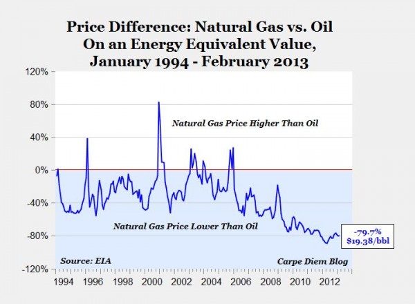 5.8. It's a seemingly unimportant number. Rarely can such a number or one single data point sum up a thesis entirely, but if we look for the overarching drivers behind natural gas infrastructure development, I believe this instance is an exception. To determine the energy equivalent output of natural gas to crude oil, we must convert spot natural gas prices by a factor of 5.8, which is how many million BTU's that one barrel of oil produces. As long as the resulting number is less than the price of crude oil, natural gas is cheaper than oil for the equivalent amount of energy produced. Energy equivalent natural gas prices are currently $25.17 ($4.34/mmBTU spot Henry Hub), well below where WTI crude trades at $99.33/bbl.