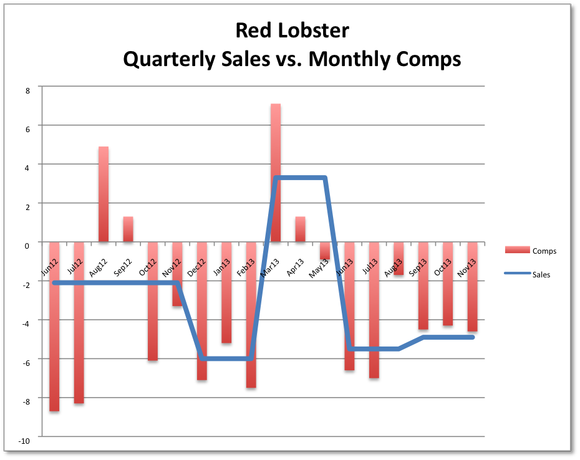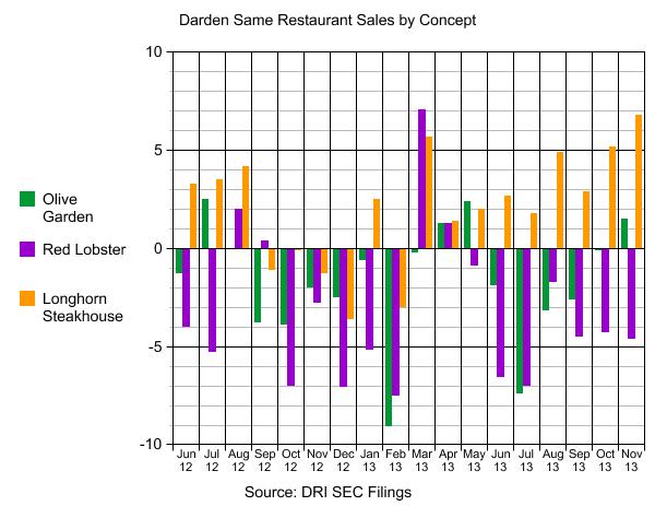 Ruby Tuesday suffered an 11.4% drop in comps at its company-owned restaurants last quarter and an 8.4% decline from franchisees. Same-restaurant sales at owned and franchised restaurants were off 1% and 2%, respectively, for all of fiscal 2013. Brinker International is witnessing the same trend at its Chili's concept, as is DineEquity at Applebee's.