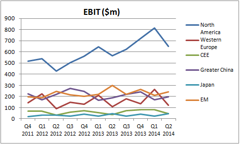 Don't be alarmed by the sequential drop in earnings before interest and taxes, or EBIT, for North America and Western Europe. In actuality, EBIT rose 14.9% and 11.8%, respectively, for these regions in the second quarter.
