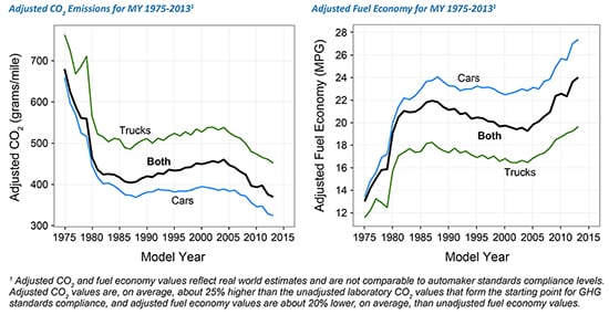 Brad Plumer shares this chart from the EPA showing how much vehicle efficiency has improved since 1975: