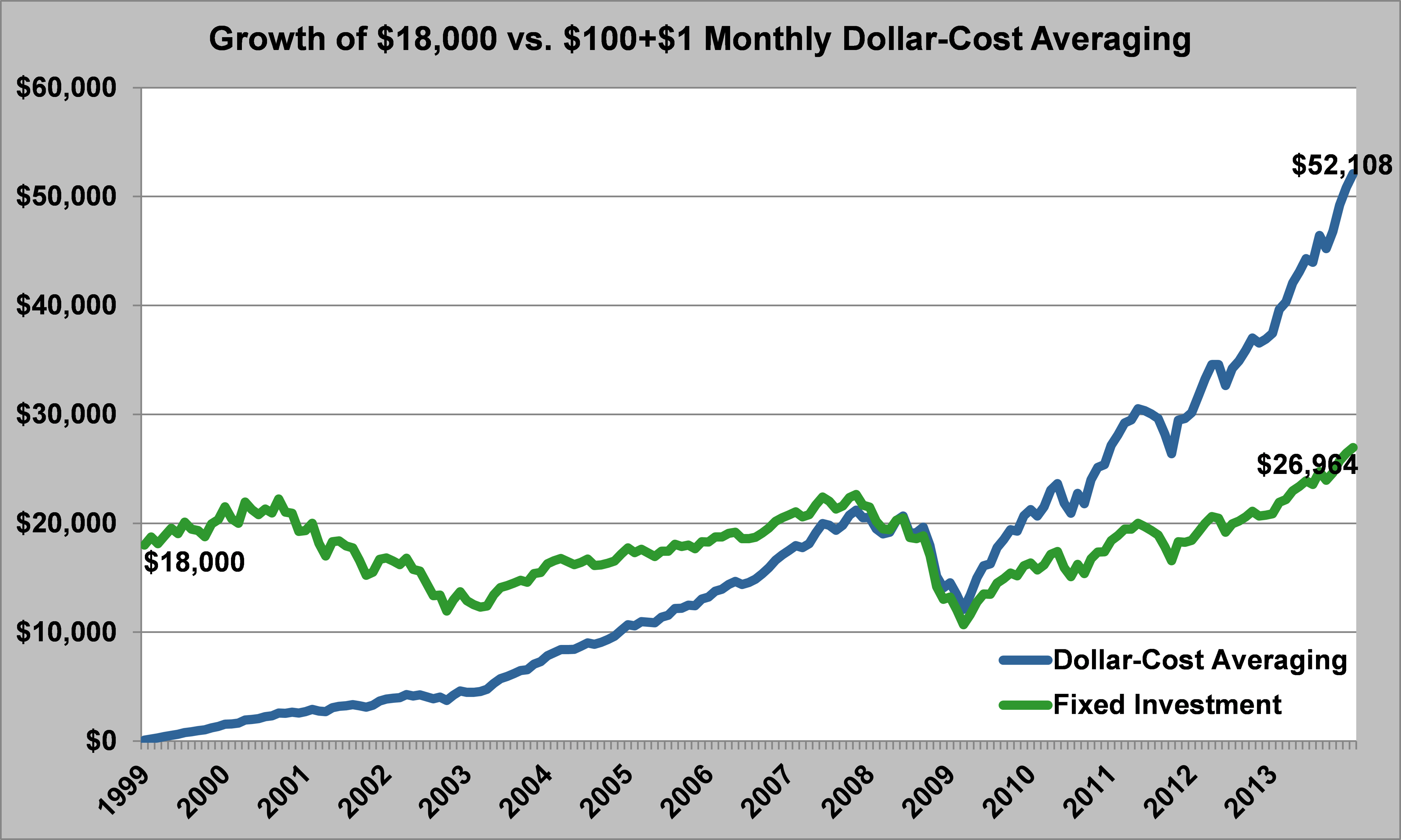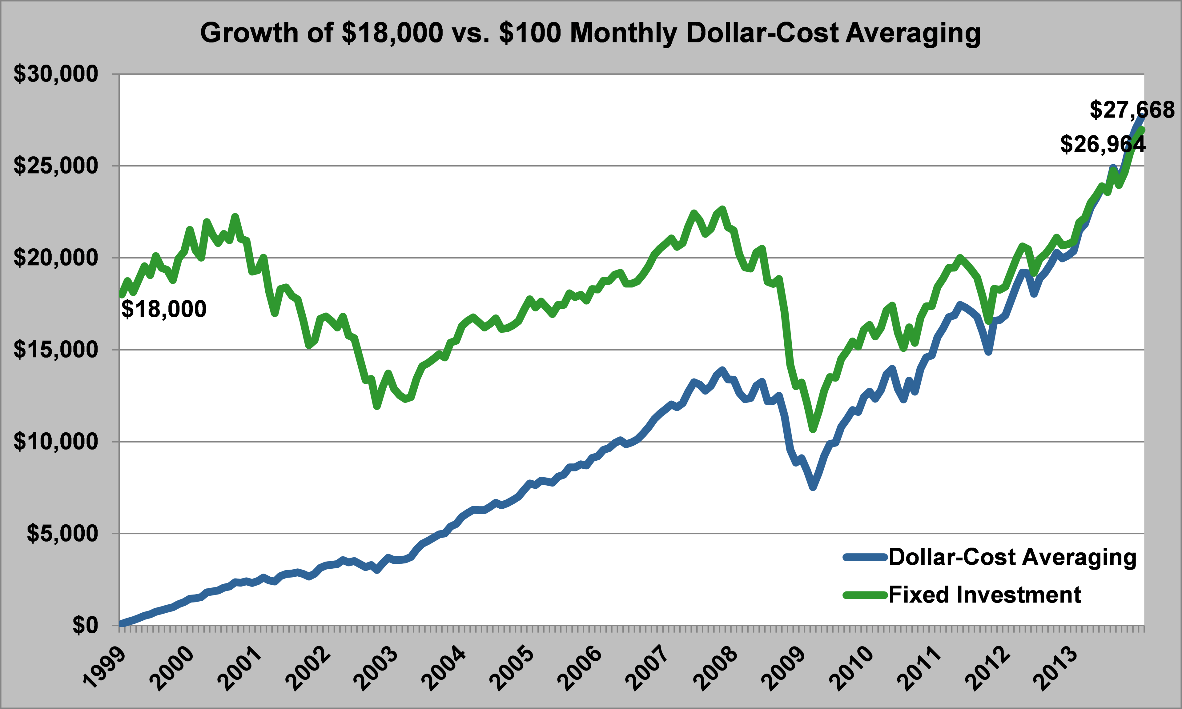 In the 180 months since the beginning of 1999, the S&P 500 is up roughly 50%. Yet a person who had $18,000 and put it all in the S&P 500 in January 1999 would have less than someone who patiently invested $100 each month into the S&P 500.