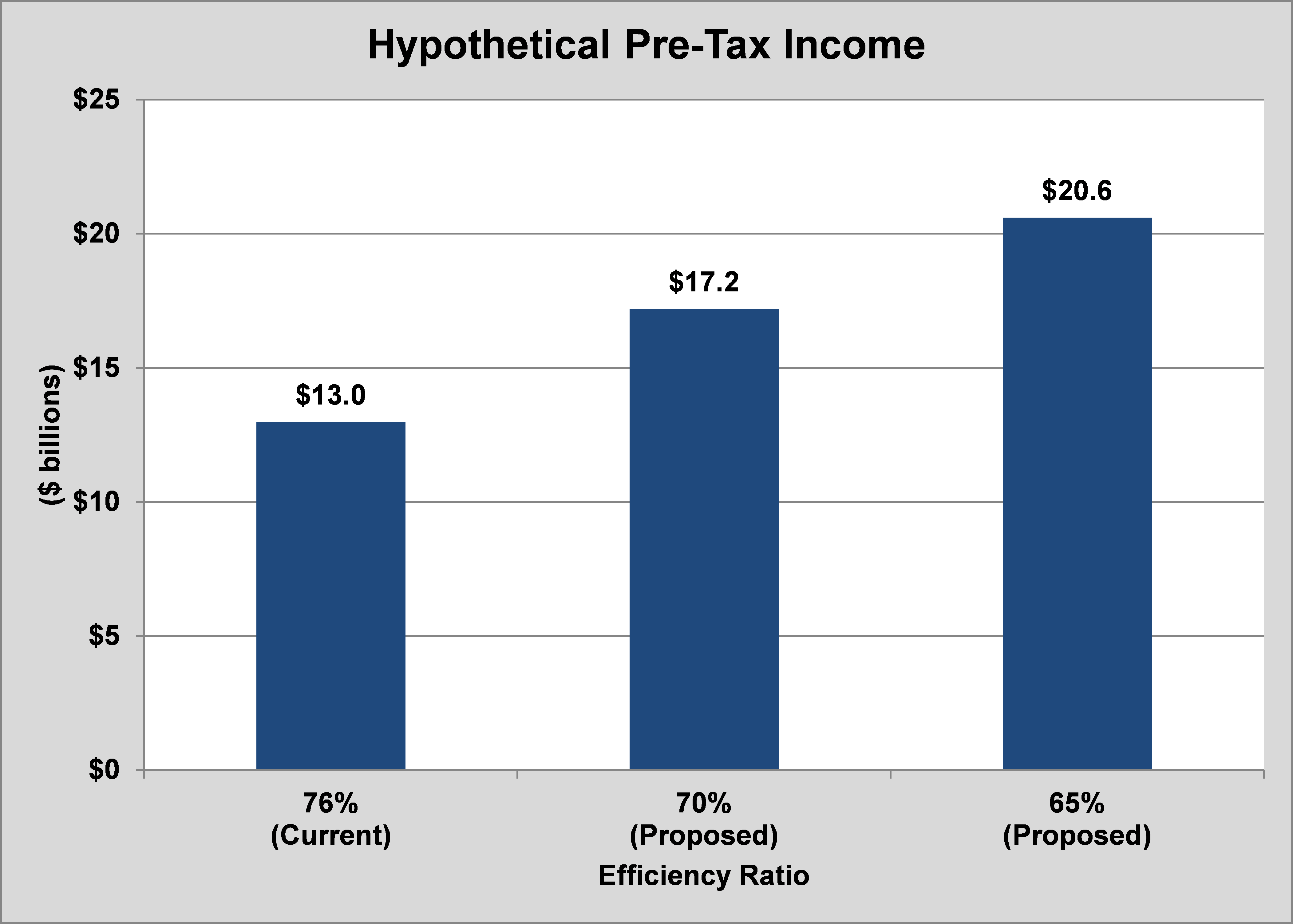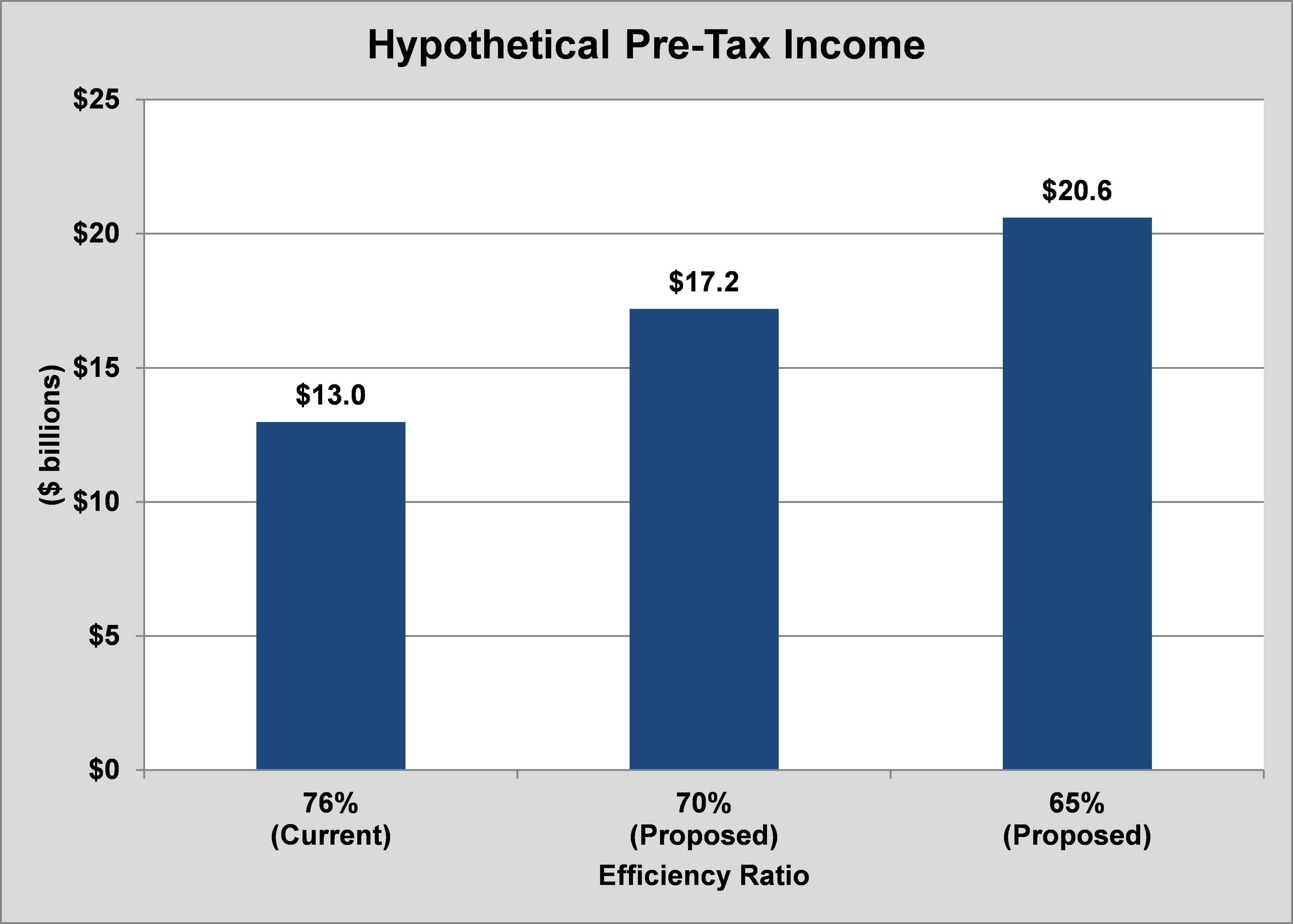 By improving its efficiency ratio to 70%, it would mean its pre-tax net income would rise by $4.2 billion, or 32%, through the first nine months of the year. If it fell to 65% -- still well above its pre-crisis levels and its peers -- its pre-tax net income jumps by $7.6 billion, representing a nearly 60% improvement: