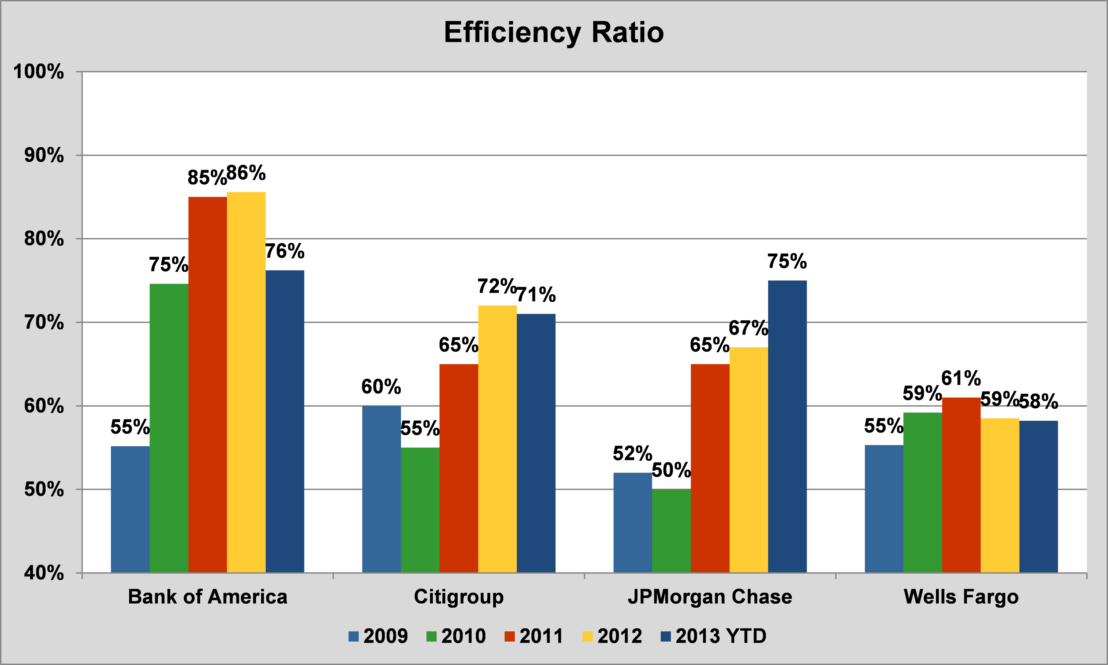 For Bank of America, 2013 has been a year when its efficiency ratio improved significantly -- falling by 11 percentage points -- but it still trails its well-known group of peers: