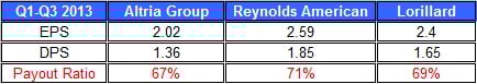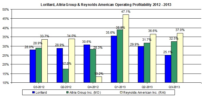 The chart above clearly shows that these tobacco companies' profitability slightly increased in the third quarter of 2013. Reynolds has led the way in this area with nearly a 37% profit margin.