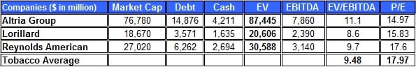Due to the sharp rise in Altria's stock price during 2013, the company's valuation has sharply increased. The table below shows the enterprise value-to-earnings before interest, taxes, depreciation, and amortization of the above-mentioned tobacco companies, and the tobacco-market average.