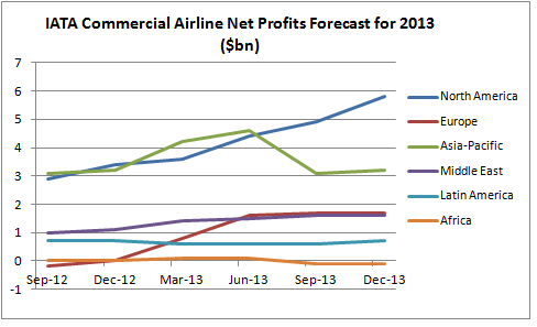 Back in 2010, Asia-Pacific airlines generated $11.1 billion in profit, while North American airlines only made $4.2 billion. However, the IATA is forecasting North American airline commercial airline profits to increase to $8.3 billion in 2014 from $5.8 billion this year. Meanwhile, Asia-Pacific commercial airline profits are forecast to be only $4.1 billion in 2014.