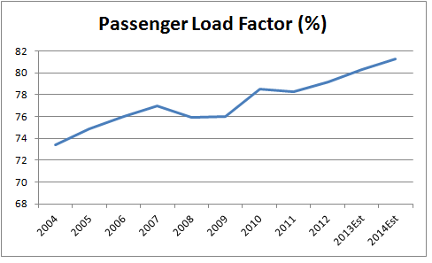 You can see the pricing power in the fact that the IATA forecasts that global net profit per departing passenger in 2014 will be at $5.94 in 2014 -- a level not seen since the peak of 2007. Western airlines' willingness to improve productivity includes buying more modern and efficient planes from Boeing and Airbus. It's significant that the airlines placing the largest orders for Boeing planes as of mid-December this year were American Airlines and European budget carrier Ryanair, with 143 and 175, respectively, out of Boeing's total of 1074. Furthermore, Boeing can look forward to a strong order book in 2014 because the IATA predicts that overall passenger load factors (a measure of airplane capacity utilization) will rise to 81.3% in 2014. In other words, capacity pressures are likely to encourage more investment in new airplanes.