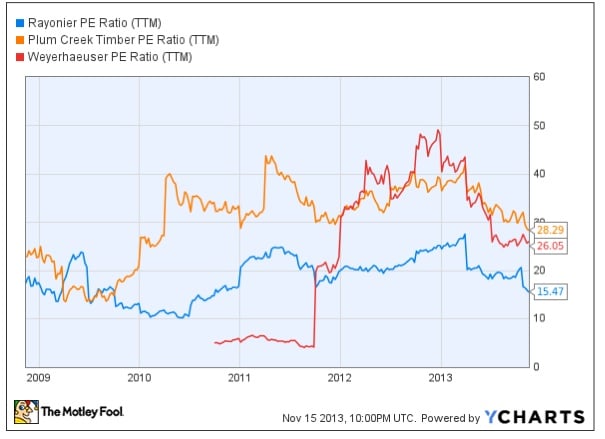 Rayonier is interesting for its dividend and growth potential. The weakness in the stock has raised the yield to 4.6% compared to 2.9% for Weyerhauser and 3.8% for Plum Creek Timber. Plum Creek has paid $1.68 for the last five years with no raises, and Weyerhauser, as a new REIT in 2010, increased its dividend in 2012 by only $0.02 to $0.62. Both Weyerhauser and Plum Creek are more diversified, but that doesn't prevent their businesses from setbacks when housing starts slow. Rayonier's focus on fibers has been a great strategy over the last decade and may still serve them well.
