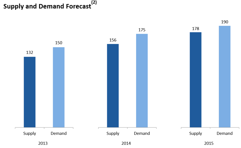 As the chart shows, demand for ultra-deepwater rigs is expected to increase in every area of the world in which these rigs currently operate except for Australia and a loosely defined area called "Other" which appears to refer to the Pacific Ocean. So, demand looks likely to increase. What about supply? Well, supply will certainly increase between now and 2015. However, Pacific Drilling states that it will still not be sufficient to meet demand.
