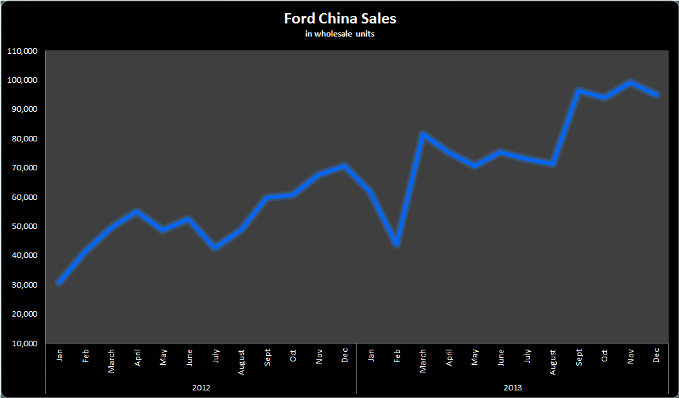 Today, Ford announced its December results in China: A 35% increase continues to impress investors. Ford China wholesales in December sold nearly 95,000 vehicles, up from 70,510 in the same month last year. That caps off Ford's strong year in the region as its wholesale volume reached 935,813 -- a strong 49% increase over 2012.