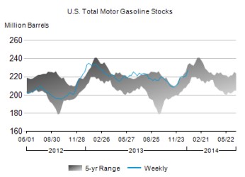 Gasoline inventories expanded 6.2 million barrels (2.9%) after increasing 0.8 million barrels the week before. Demand for motor gasoline during the last four-week period is up a seasonally adjusted 4.8%. In the last year, supplies have fallen 2.6%.