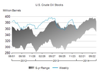 After falling 7 million barrels the previous week, this latest report marks the sixth-straight week that supplies have shrunk. Continued demand from refineries has kept inventories pushing down in the past month. Overall inventories have dropped 1% in the past 12 months.