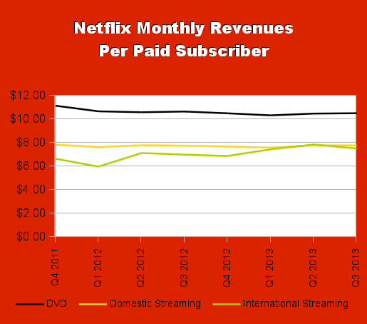 The company does offer DVD plans ranging from $4.99 a month (one disc at a time, maximum two per month) to $43.99 (eight discs at a time, no monthly limits). Netflix doesn't break down its reported numbers to the detail level of plan-by-plan membership counts, but you can get a sense of the relatively low risk by calculating the average monthly revenue per paid subscriber dating to 2011. Let's throw in streaming plans here for good measure: