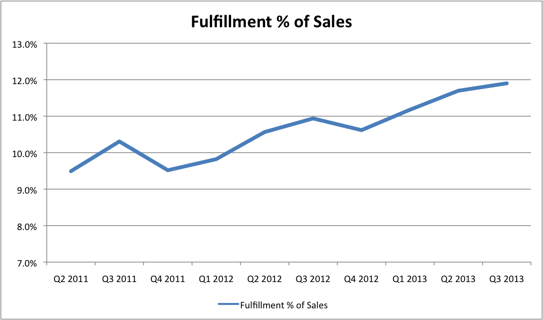 The shipping problem is already starting to show up in Amazon's results. Since second-quarter 2011, fulfillment costs have risen from 9.5% of sales to 11.9% of sales. UPS and FedEx are eating up any improvement Amazon may have seen from improved gross margin over that time frame.