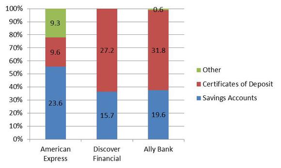Taking a closer look at the online lenders, there is one company that appears to be at the greatest risk of customers withdrawing their funds: American Express. The chart below details the makeup of the various deposit accounts held by American Express, Discover Financial, and Ally Bank: