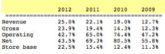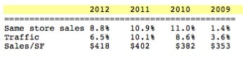 The company has long warned that same-store sales in double-digits are not sustainable in their filings: "We do not expect our 11% fiscal 2010 comparable store sales increase to continue into the future. Our long-term annual comparable store sales increase target is 3% to 5%."