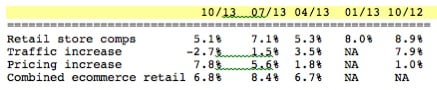 The negative traffic numbers in the third quarter are concerning and may indicate the number of new stores opened are likely poaching customers from older locations. Comps were definitely compromised. The other troubling trend is revenue growth lags store growth and comps by a wider margin -- one interpretation is new store sales are taking off more slowly. Overall, expansion was too fast and that was a major talking point in the conference call. The numbers support that.