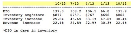 Ulta opened 114 stores in the first nine months of 2013 and 55 stores in the third quarter alone. New stores need inventory but inventory levels have been climbing faster than revenue, and the company is sitting with more inventory per store than it has held in over two years. And that's even accounting for a third quarter holiday inventory build.