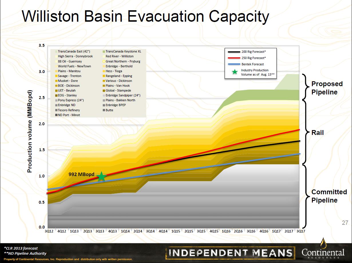 Sure, all companies that use rail will suffer, but Continental and Oasis would disproportionately suffer because they are so dependent on rail to move oil. If the two companies were to commit more of their oil to pipelines, they would take a small hit on realized prices, but reduce the risk of disrupting their takeaway capacity.