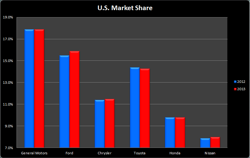 But as the three domestic automakers entered December 2013, they were on pace to accomplish that feat legitimately. While GM ended up flat for the year, Ford gained far more than any other major automaker.