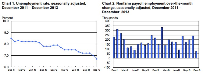 While the unemployment rate dropped from 7% to 6.7% -- its lowest level since October 2008 -- the decline was primarily due to a drop in the labor force. Once people without jobs stop looking for one, the government no longer counts them as unemployed. Year over year, the civilian labor force participation rate -- including those working or looking for work -- is down 0.8 percentage points to 62.8%, matching a nearly 36-year low.
