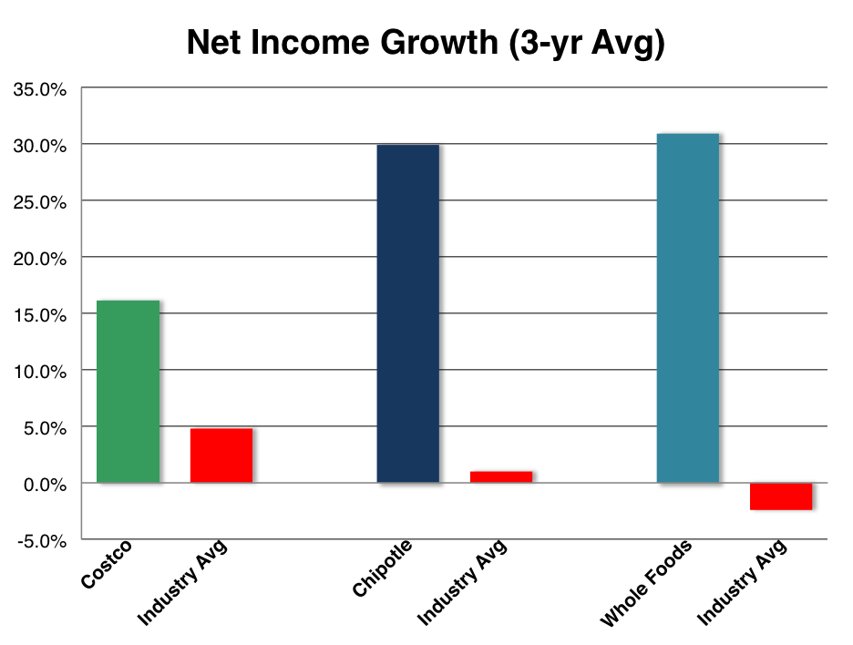 Over the past few years, for example, Costco grew revenue at 10.5% compared to an industry average of 5.5%. Chipotle grew its top line at a hefty 21.6%, versus a 7.6% growth rate from its peers. And what about the green grocer? Whole Foods grew nearly six times as fast as its average competitor: 12.8% versus 2.2%.