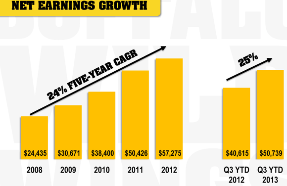Meanwhile, Buffalo Wild Wings' multiyear innovations and reinvestment in the business and expansion to the current 960 locations in the U.S., Canada, Mexico, Philippines, Saudi Arabia, and United Arab Emirates have led to a 24% five-year earnings CAGR and 25% revenue CAGR.