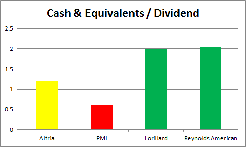 However, investors should prefer cash coverage like that of Lorillard and Reynolds American, which could close down for two years and still maintain their dividends. Philip Morris International does not have much cash on hand relative to its dividend, but its cash from operations is so high that there is little doubt about its ability to increase its dividend in the future.