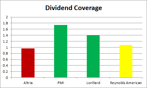 Of the four companies discussed, Philip Morris International and Lorillard have the most attractive dividends. They both yield more than 4% and have significant cash coverage. Altria and Reynolds American are the most generous dividend payers, but their ability to raise their dividends in the coming years will be hampered by low cash coverage.