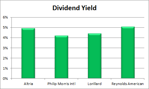 Since tobacco companies tend to have liberal dividend policies and limited growth prospects, they usually offer above-average dividend yields. The average S&P 500 index company yields approximately 1.9%. Altria, Philip Morris International, Lorillard, and Reynolds American each exceed the average by a factor of two.