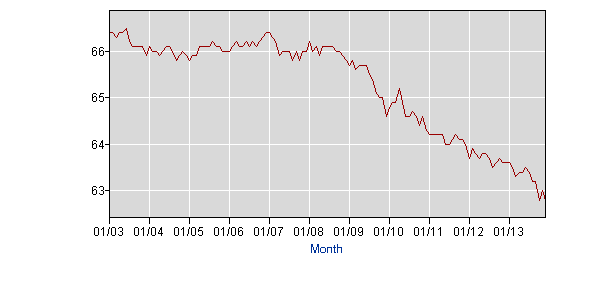To put this into a totally different context, total nonfarm payroll employment (seasonally adjusted) of 136.9 million is currently at levels comparable to what the BLS reported in July 2008 at 137.1 million. However, over that span the labor participation rate has actually fallen from 66.1% in July 2008 to 62.8% in December 2013. In other words, we've seen no improvement in actual jobs creation; we've just witnessed the number of people who want jobs declining -- that's not good!
