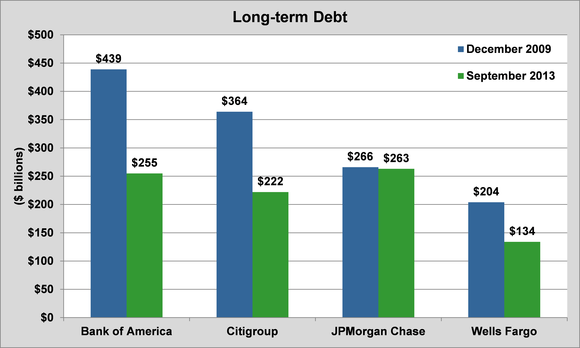 As you can see, JPMorgan Chase has actually kept its debt level relatively stable, and while Citigroup and Wells Fargo have also aggressively lessened their debt burdens, they cannot match the cutting done by Bank of America.