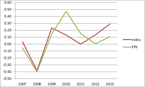 To hone in on more recent data, here's a graph highlighting the percentage change between the index price and earnings per share for the S&P 500 from 2007 to 2013.
