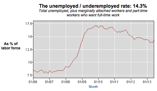 In the most recently reported month (November 2013), unemployment finally dropped back down to 7%. Unfortunately, official unemployment doesn't tell the whole story. Because of the long-term recession, many workers simply dropped out of the workforce -- meaning they're not counted in unemployment statistics. This drops the unemployment rate to "artificially" low numbers.