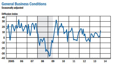 For January, the survey's general business conditions index clocked in at 12.5 points, up from December's revised 2.2 reading. . Analysts were pleasantly surprised by the index, having expected only a slight uptick in growth to 3.3.