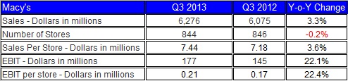 The table above shows that Macy's revenue increased by 3.3% despite its decision to close a couple of stores during the third quarter. The company's average store revenue rose by 3.6%. This means the company's gain in sales was mostly organic. Moreover, Macy's improved its operating profit by 22%. Target, much like Macy's, also increased its sales by 4% during the quarter. But part of its gain in sales was due to opening a net 16 stores during the past year.