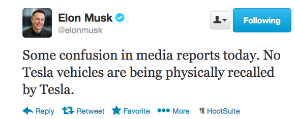 Therefore, as Tesla CEO Elon Musk was quick to point out today on his Twitter account, this isn't a "recall" in the traditional sense. Similar to a laptop computer, the Model S can receive software updates over a WiFi connection that improve the car's performance or, in this case, fix problems. By running an over-the-air update for the charging system, Model S drivers are able to remedy the issue without the added inconvenience of bringing their cars into a Tesla service center.