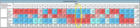 Below is a peek at the data from the University of Chicago's General Social Survey. For this particular question, respondents in this survey -- who are asked a wide variety of questions during the 90-minute interview -- are signaling their level of confidence in banks and financial institutions. The top row is for "a great deal" of confidence, the middle row covers "only some" confidence, and the third row is for "hardly any" confidence.