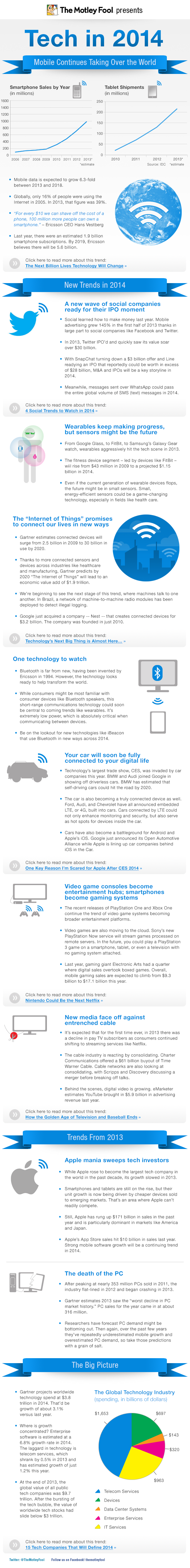 We've laid out a full look at technology in 2014 in the comprehensive infographic below. We've identified key technology trends for the coming year, and how they'll affect the world around us and investors. Not only that, but you'll get an update on trends from 2013 such as the continuing dominance of Apple (AAPL +0.46%) across the technology world and declining PC sales.