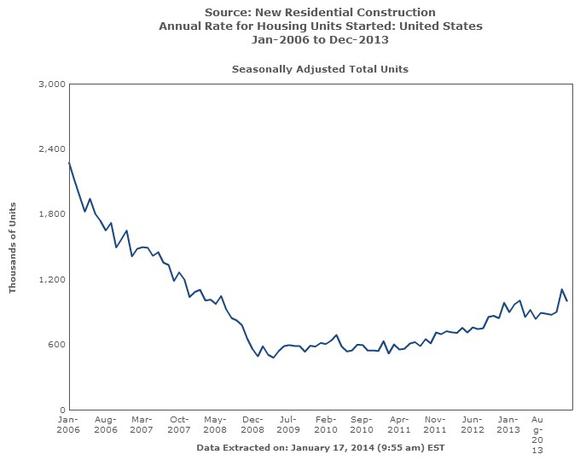 For 2013 overall, housing starts shot up 18.3% above 2012's rate, permits increased by 17.5%, and completions added on 17.4%.