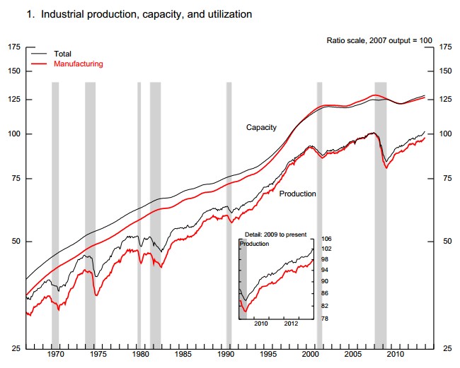 Comparing December 2013 to December 2012, overall production is up 3.7%, manufacturing has increased 2.6%, and capacity utilization has expanded 1.8%.