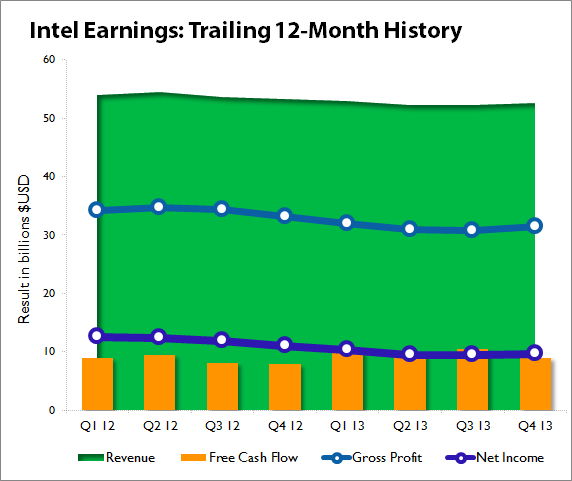 This latest quarter came in slightly above Intel's earlier guidance midpoint of $13.7 billion, but its second- and third-quarter results came in a hair below the middle of their guidance ranges this year. If we assume that the $12.8 billion midpoint is the likely result for Intel's revenue in the current quarter, we wind up with a very modest 2% year-over-year improvement versus 2013's first quarter, but a 1% year-over-year decline on a trailing 12-month basis.