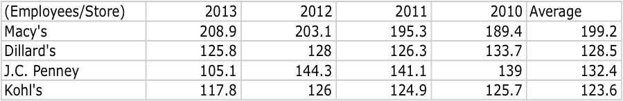 Looking at the table above, we see that despite the higher level of growth and profitability the company experienced in comparison with its peers, Macy's does have the largest number of employees on a per-store basis. This number has only been growing too! Between 2010 and 2013, the average number of employees per store has risen by 10.3%. This compares to the 5.9% drop seen at Dillard's, the 6.3% drop at Kohl's and the 24.4% drop at J.C. Penney.