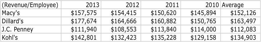 Although employees are oftentimes a company's largest cost, they also help generate revenue through the services they perform and the goods they produce. One way to test the value of a company's employees is to compare the revenue per employee of a company to those of its peers. Sure enough, despite the higher headcount, the greater number of employees per store at Macy's doesn't appear to be impairing its revenue. In fact, the revenue generated per employee at Macy's is actually more than each of its peers with the exception of Dillard's.