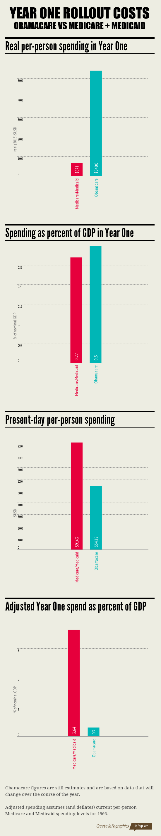 Many of these problems were, of course, overcome without any of the catastrophes now predicted for the smaller and more conservative Obamacare rollout. However, the costs of Medicare and Medicaid combined in 1966 added up to $2.2 billion, or about a third of 1% of national GDP that year. This is in line with Obamacare's anticipated total costs this year, but there's one caveat: Real per-person medical spending was a heck of a lot lower in 1966 than it is today.