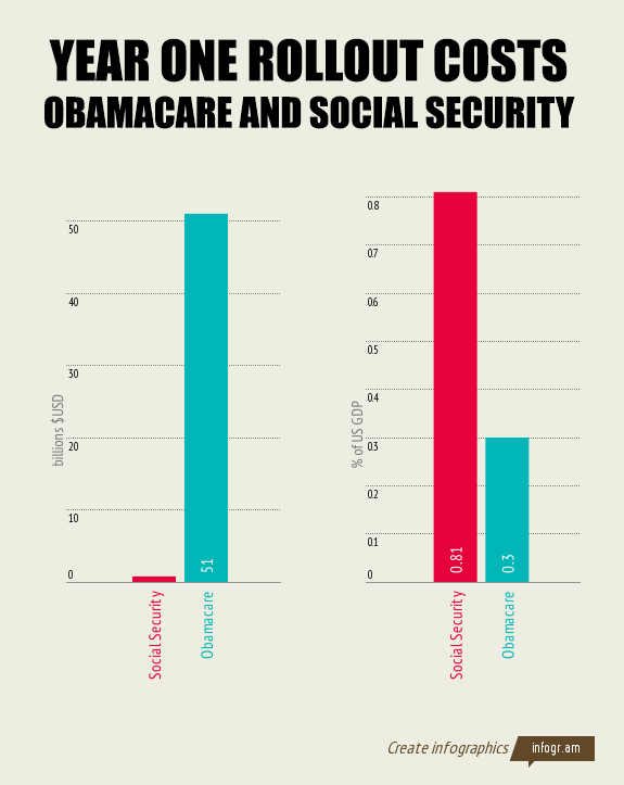 But if you ask political historians, you might be surprised. The United States has been rolling out major new social-insurance programs for eight decades now, beginning with Social Security's first tax levies in 1937. While Social Security and the Medicare-Medicaid combination were certainly more ambitious reforms than Obamacare from a coverage and governance perspective, their early costs and rollout hiccups can be instructive for anyone fretting about costly "death spirals" or unintended budgetary consequences. And there were hiccups.