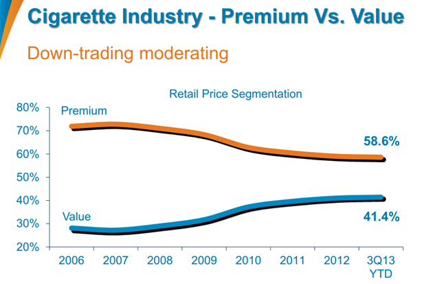 Unfortunately, it would appear that Reynolds is not interpreting its own research correctly, as even the company's value offering is not reporting higher sales. Specifically, for the first nine months of 2013, sales of Reynolds' premium cigarettes fell 6.2%, and sales of value cigarettes fell 6.3%.