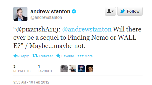 However, Stanton has definitely warmed up to the idea since then. When asked about a sequel to either Finding Nemo or WALL-E on Twitter in early 2012, he offered this coy reply: